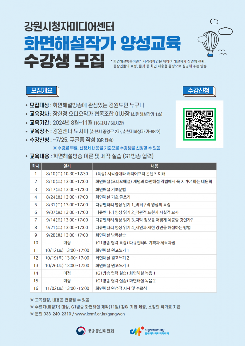강원시청자미디어센터 - 2024 화면해설작가 양성교육 수강생 모집